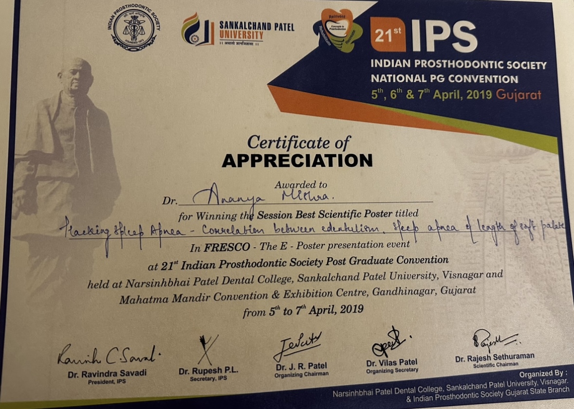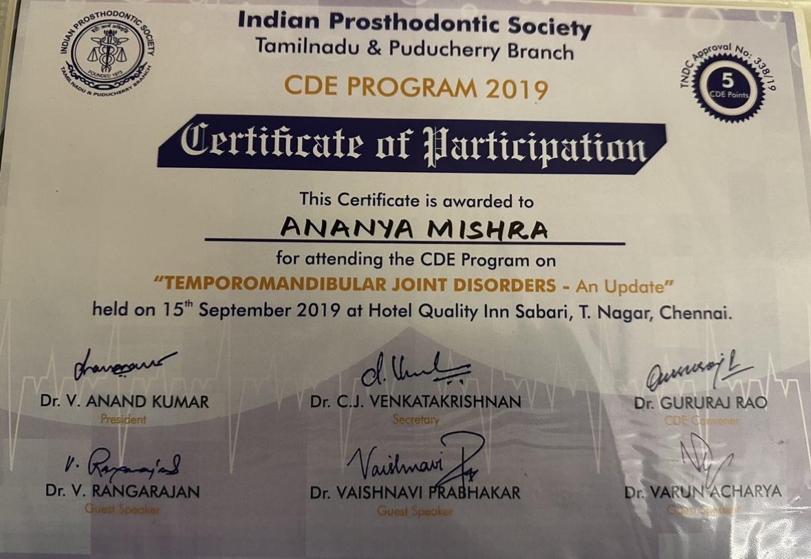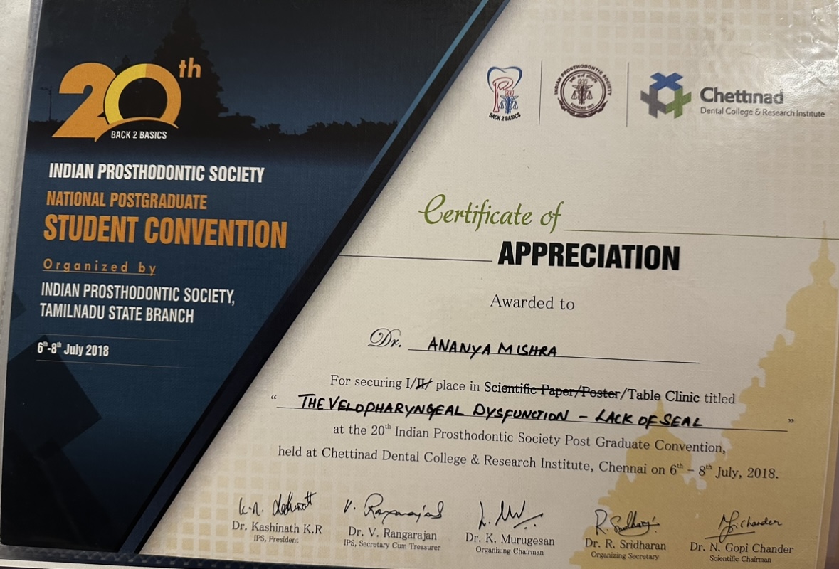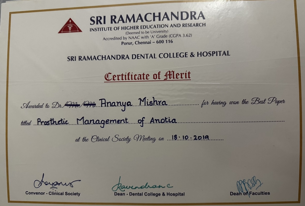 She then did her post-graduation in Oral & Maxillofacial Prosthodontics & Implantology from the prestigious Sri Ramachandra Institute of Higher Education & Research, Chennai.