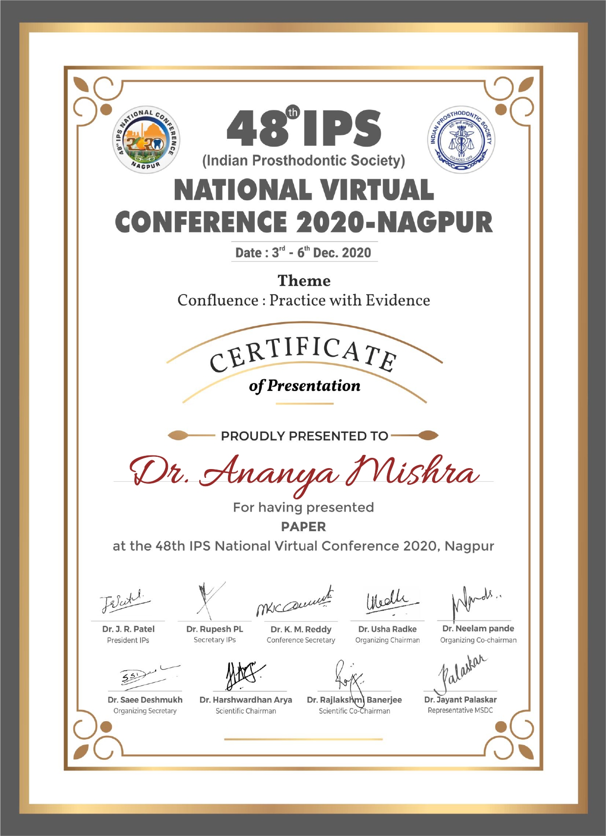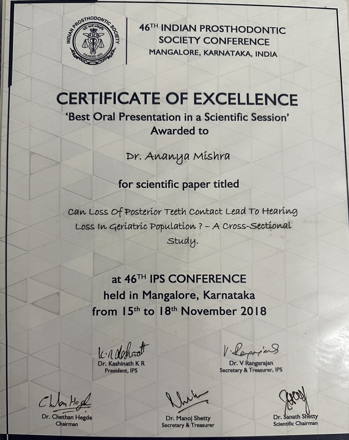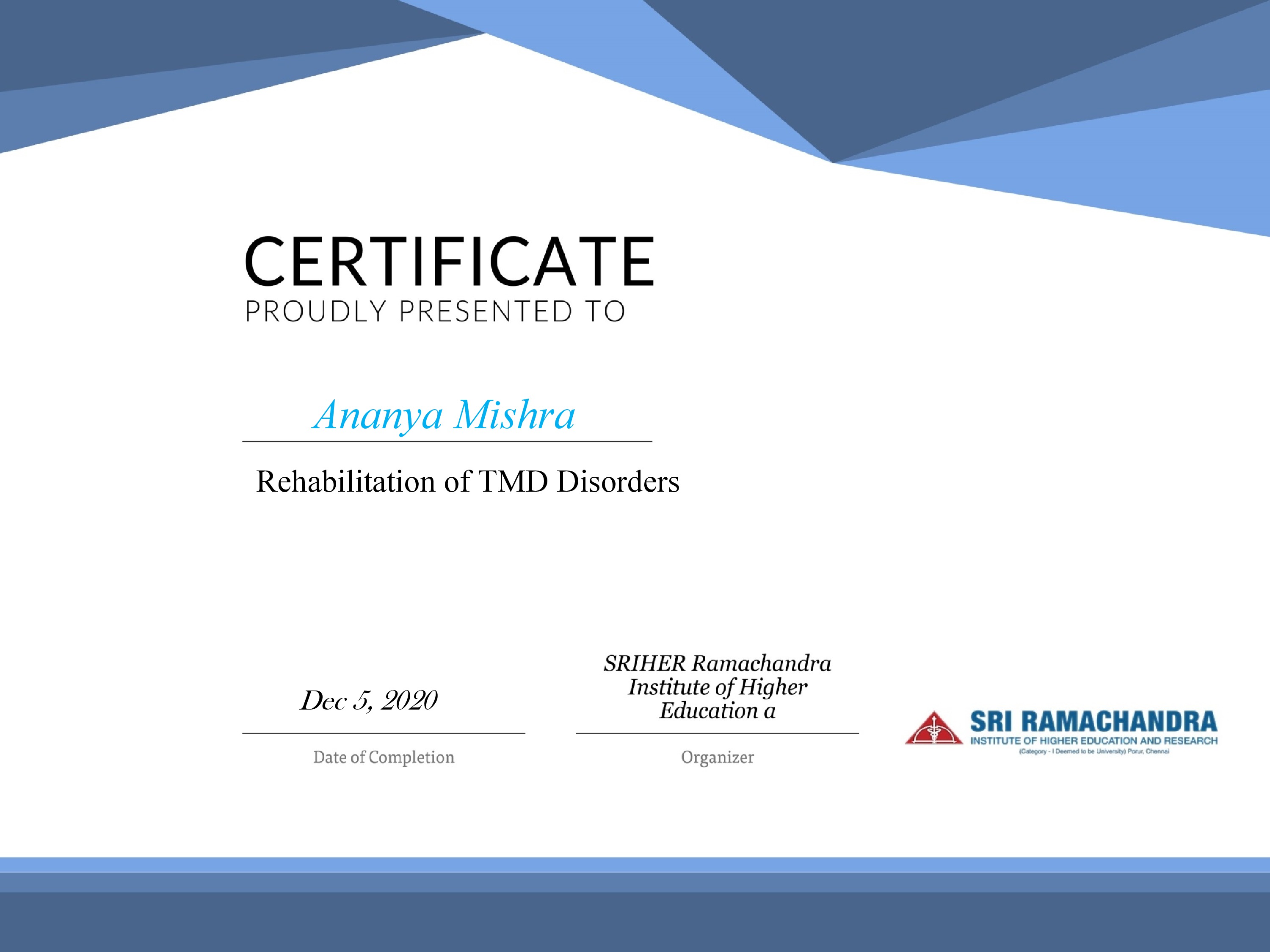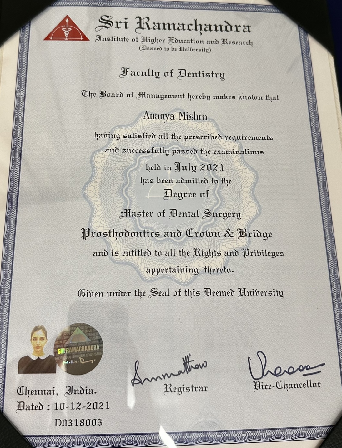 She then did her post-graduation in Oral & Maxillofacial Prosthodontics & Implantology from the prestigious Sri Ramachandra Institute of Higher Education & Research, Chennai.