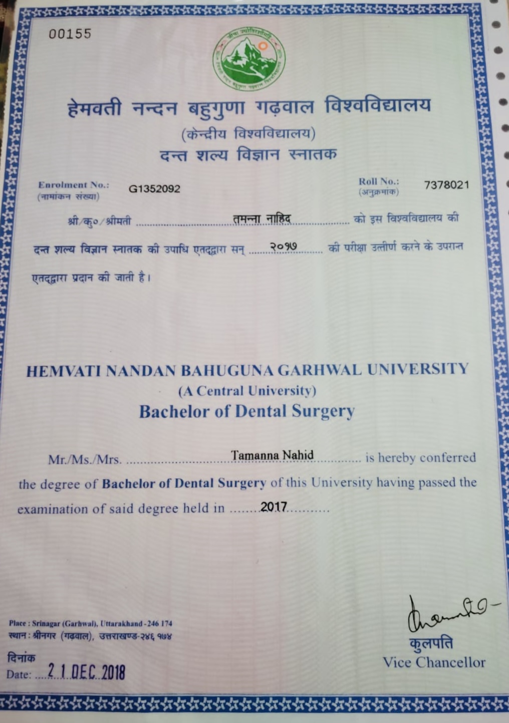 Dr. Tamanna Naid completed her BDS from Hemvati Nandan Bahuguna Garhwal University.