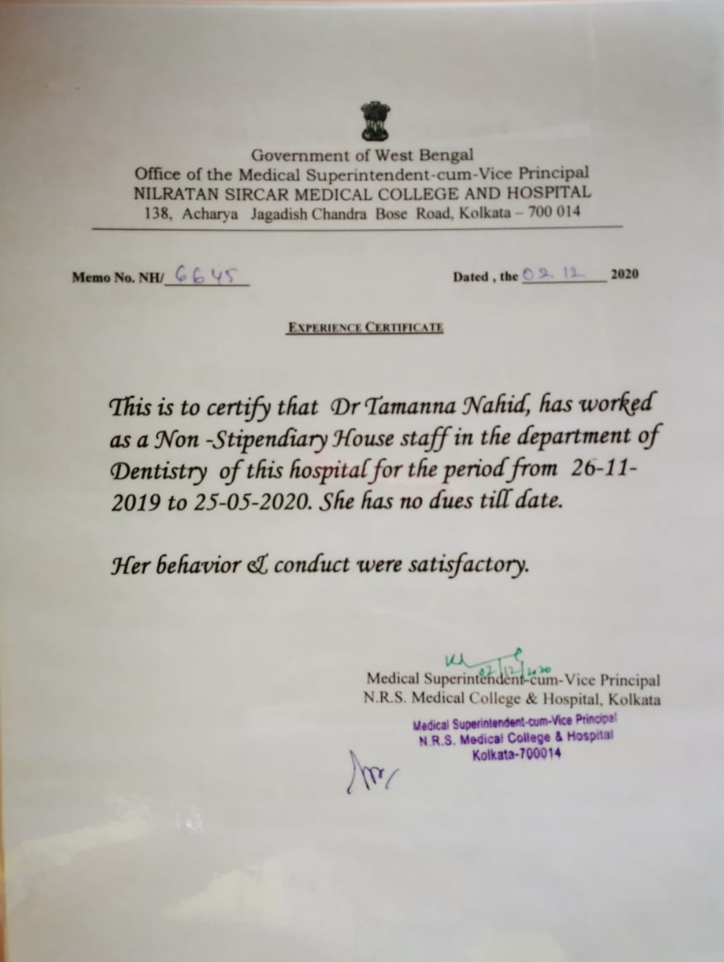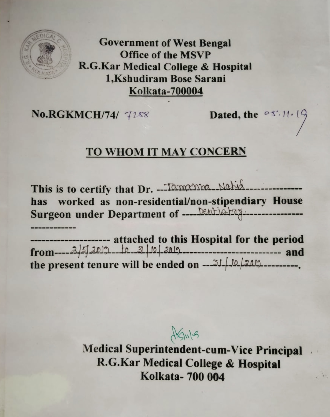She was a House Surgeon at the Department of Dentistry at R.G.Kar Medical College & Hospital, Kolkata